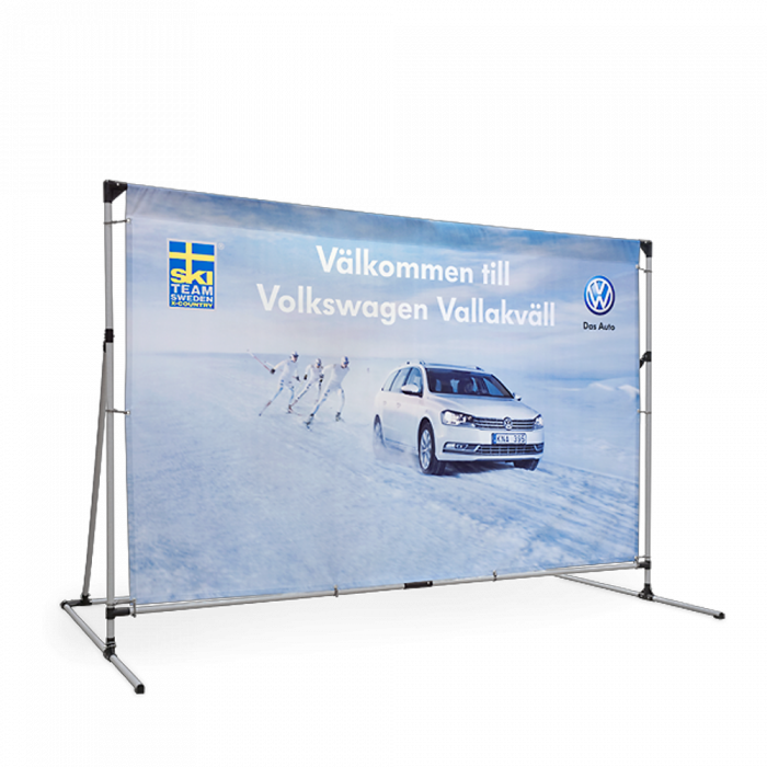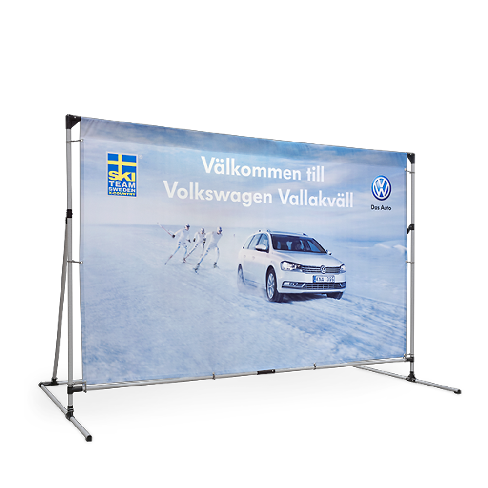 Bannerstativ – EXL Event er en stabil billedvæg, der samles uden brug af værktøj. Det bruges til butikscentre, sportskonkurrencer, messer og events. Et slidstærkt banner med tryk er inkluderet i prisen. Det er et velegnet produkt til brug både indendørs og udendørs, og vi bruger miljøvenlig trykfarve. Trykkvaliteten er den bedste, der fås, og resultatet bliver fremragende. Vores trykkeri, der ligger i Norrköping, bruger et robust bannerstof, der er kraftigt og slidstærkt og passer perfekt til denne fritstående billedvæg. Det tager kun et par minutter at opsætte dette store banner i den praktiske udstillingsstander.