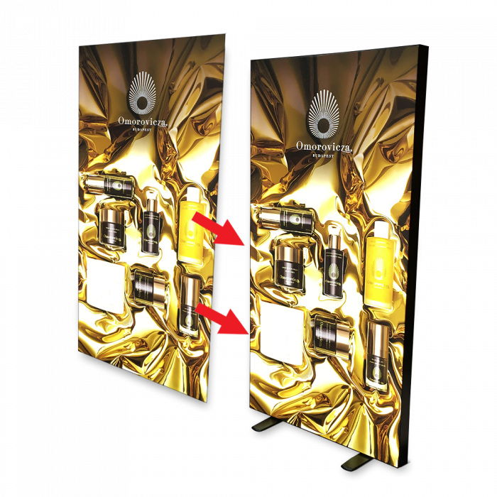 Billede til Popup LEDBOX er billeder til markedets smukkeste lysboks. Meget let installation uden værktøj. Størrelsen er 100x200cm. Lysboksen med design er velegnet til indretning i butikker og står fast med fødderne. Det trykte stof har en gummistrimmel, og du kan nemt ændre billedet. Lysboksen er dobbeltsidet, men du bestiller billederne individuelt!