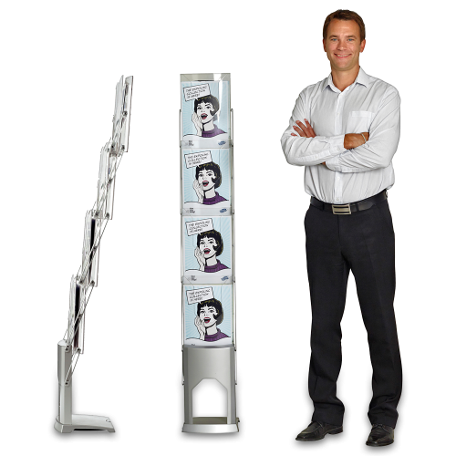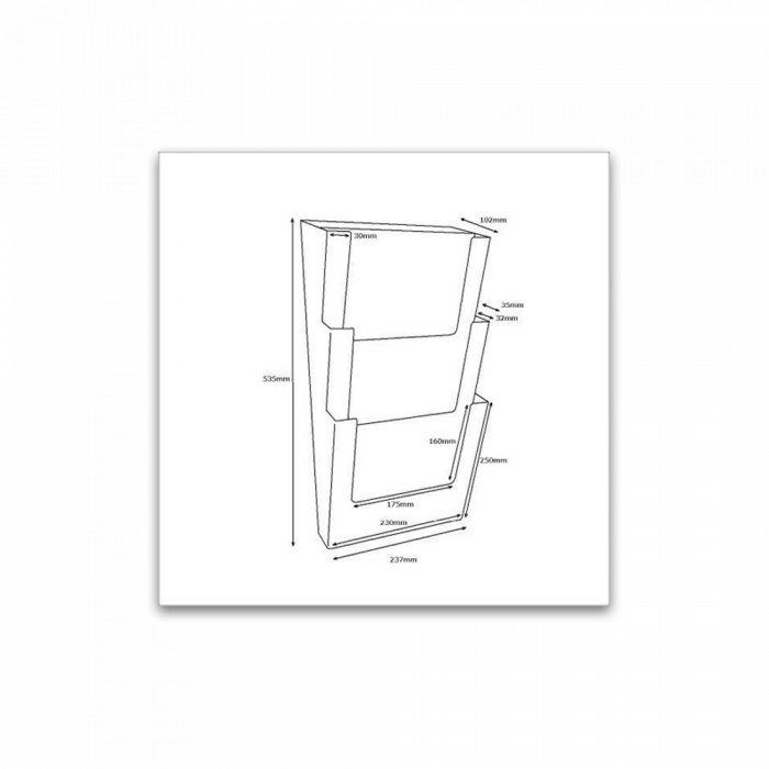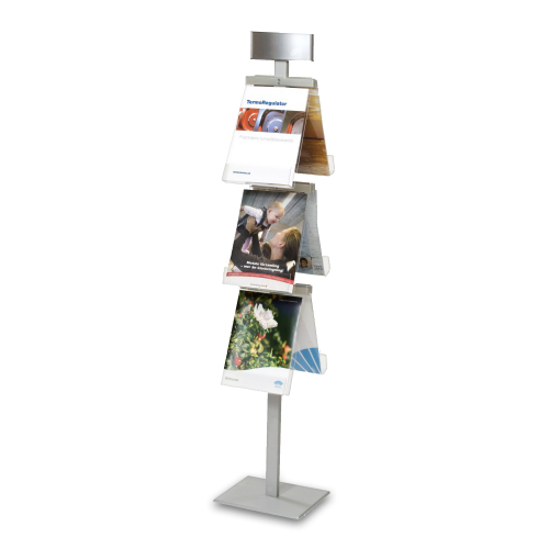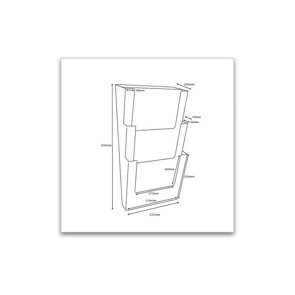 Se målskitsen, så jeres foldere, brochurer og andre tryksager passer. Passer fint som tidsskriftsholder i venteværelser, og der er plads til tre forskellige oplysningsmaterialer, eller I kan fylde samme tryksag i alle tre lommer. Fordelen ved flere lommer er naturligvis, at brochureholderen rummer mange eksemplarer, så den ikke skal fyldes op så ofte.