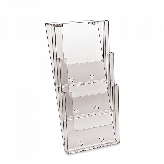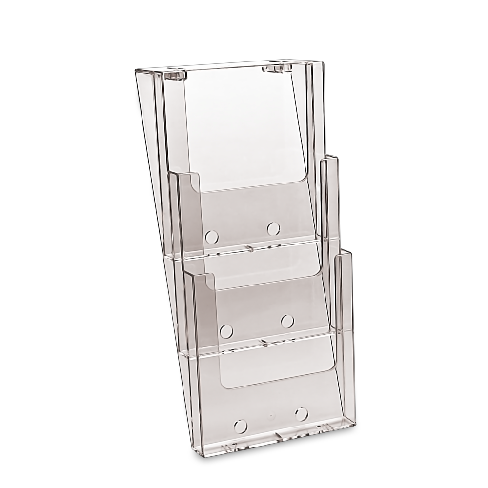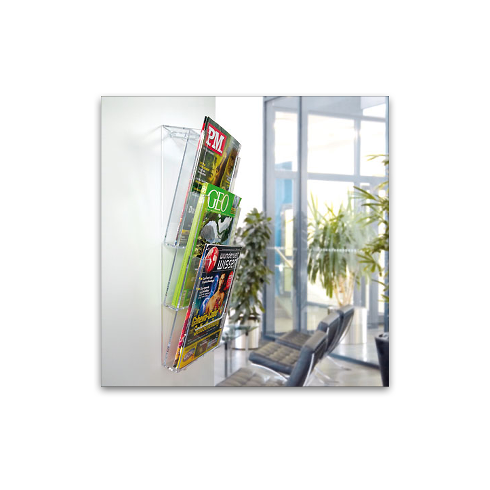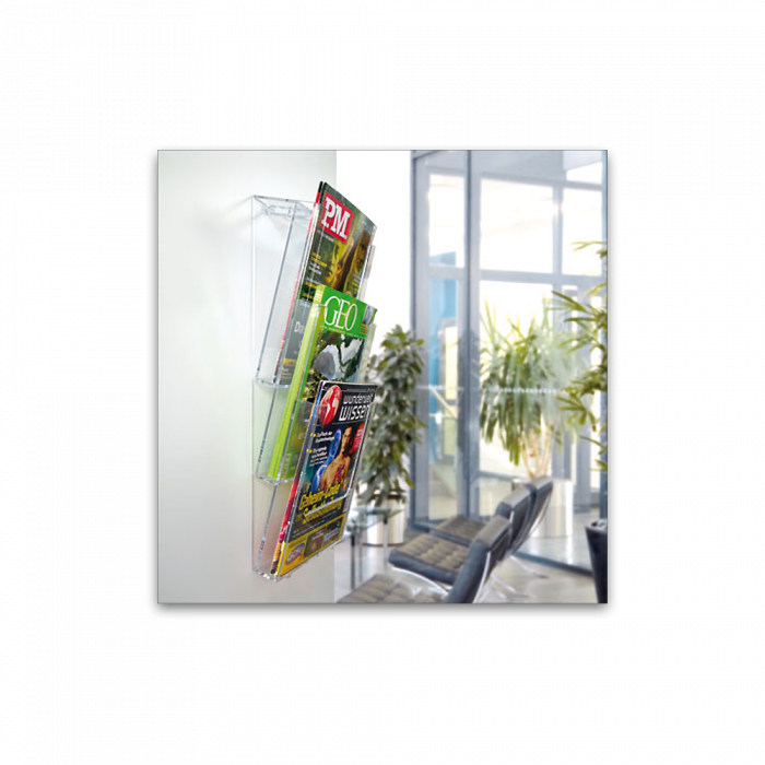 Brochureholder til væg 3 x A4 hænges op på væggen, så foldere, tidsskrifter og brochurer kan vises frem. Formstøbt glasklar polystyrenplast med runde, bløde kanter, som er blide mod fingrene.