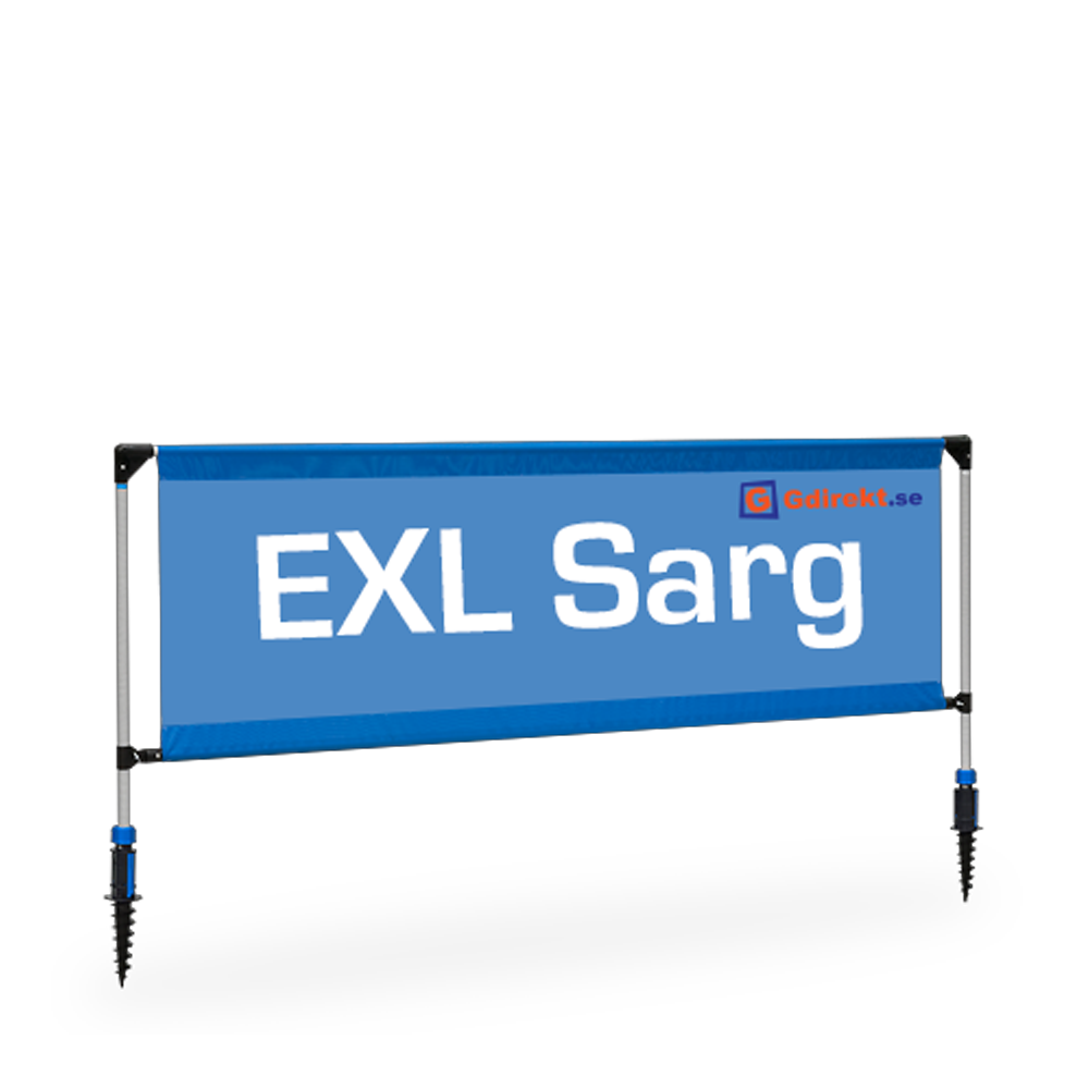 EXL Banner Sarg – et bannerstativ til sportskonkurrencer, messer og events. Dobbeltsidet eller enkeltsidet til indendørs og udendørs brug. EXL Banner Sarg fås i to størrelser, vælg nedenfor. Billede, jordskrue og taske inkluderet. Køb til montering til flade overflader.