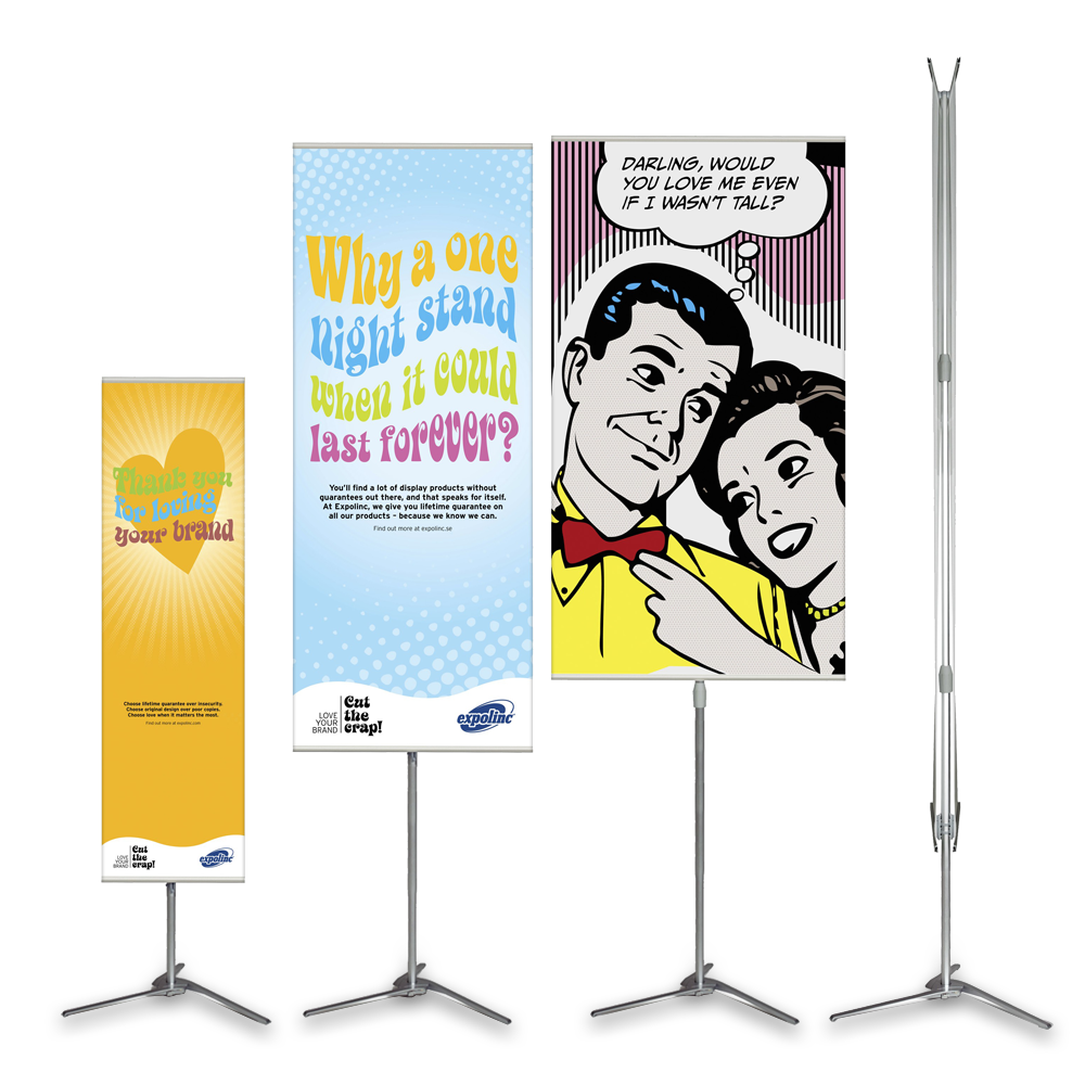 Pole System-displaystander – Expolinc fås i flere bredder og har en højde på 100-240 cm. Opstillingen klares let på ingen tid. Fold støttebenene ud, træk teleskopstangen op, og sæt billedet fast.