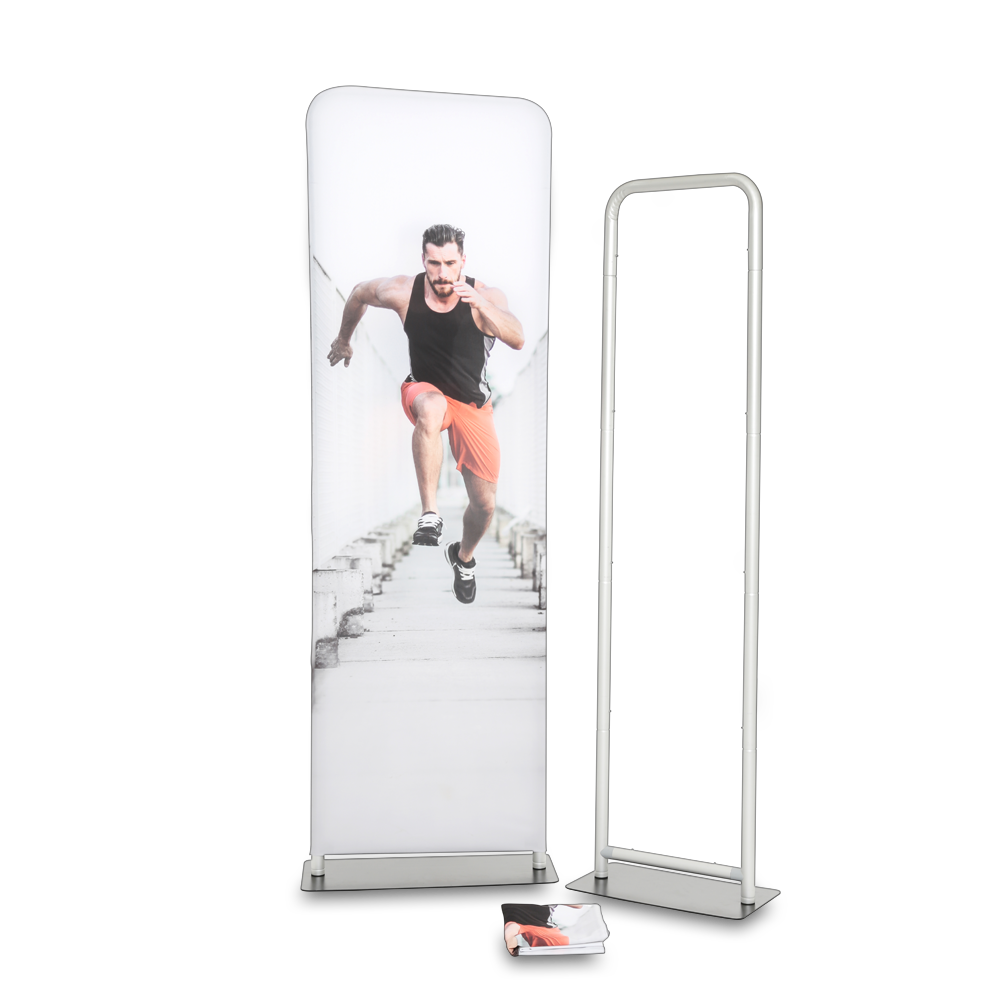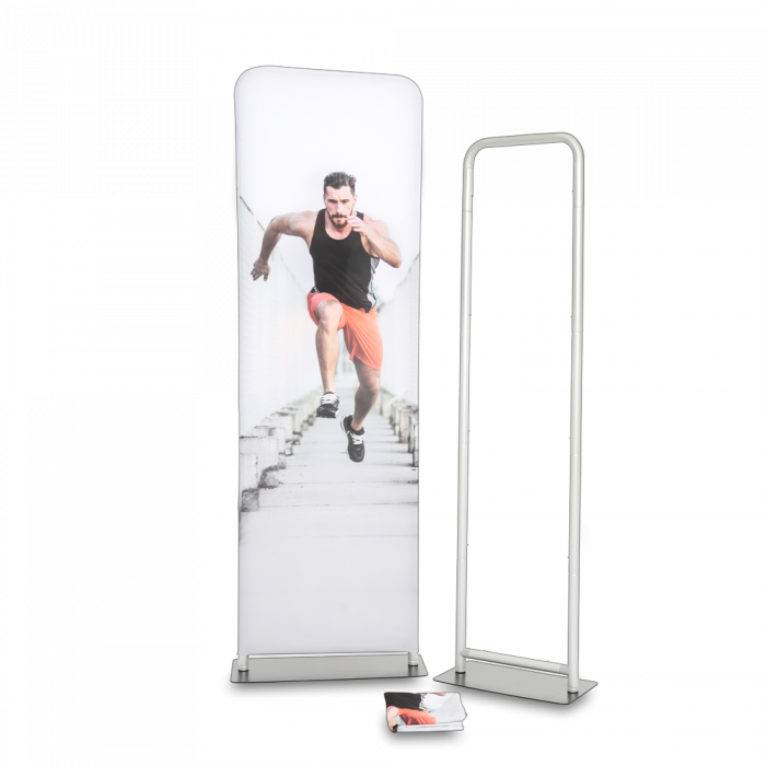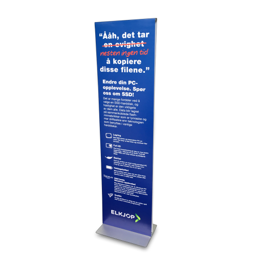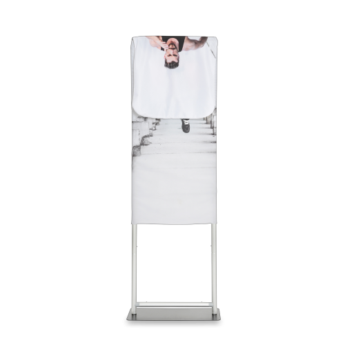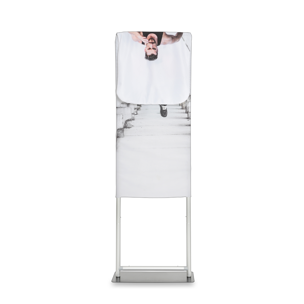 Retail Stand er en gulvstander med trykt reklamebudskab i stof. Man trækker et stykke stof, der er syet som en hue, over standeren. Få billige kampagnestandere ved at købe på nettet hos os.