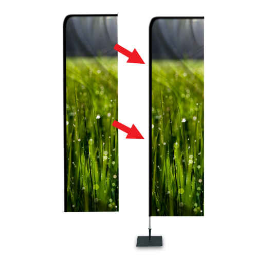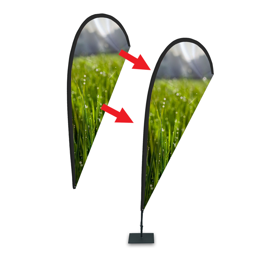 Beachflag Droppen – kun flag er vores prisbillige strandflag. Har I allerede en stander eller holder til beachflaget, men vil skifte motivet ud? Så køber I det nemt hos os. Det er fremstillet i perforeret flagpolyester. Vi producerer selv alle beachflag, her er ingen mellemled som hos de fleste andre. Strandflag Droppen fås i tre forskellige størrelser. Small (75 cm bredt, totalhøjde 210 cm), medium (135 cm bredt, totalhøjde 315 cm) og large (150 cm bredt, totalhøjde 395 cm højt). I vælger, hvilke fødder og fastgøringssæt I vil bruge. Det afhænger af, hvor eventen eller nyåbningen skal være.