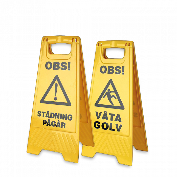 Varningsskylt – Städning pågår halt-våta golv beställer Ni enkelt här. På ena sidan står det ”STÄDNING PÅGÅR” och på den andra sidan står det ”VÅTA GOLV”. De är 65cm höga och man fäller enkelt upp dem och ställer ut dem så ingen halkar.