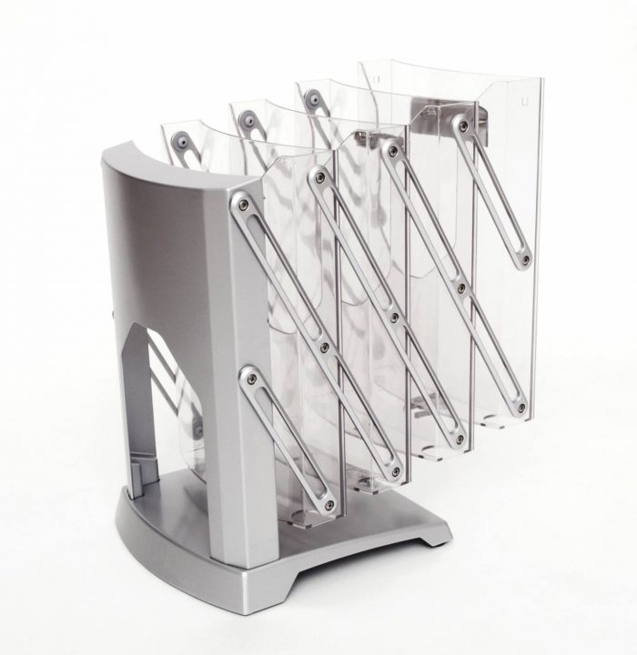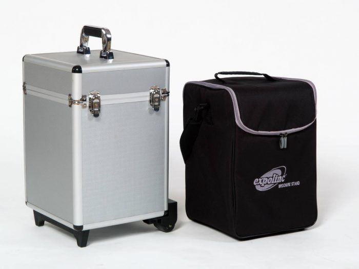 Broschyrställ – enkelsidigt ihopfällbart är framför allt i hög kvalité. Broschyrstället är lätt att fälla upp och ner. Står stadigt med en låsbar säkerhetsknapp. Levereras en svart vadderad i svart väska i tyg.