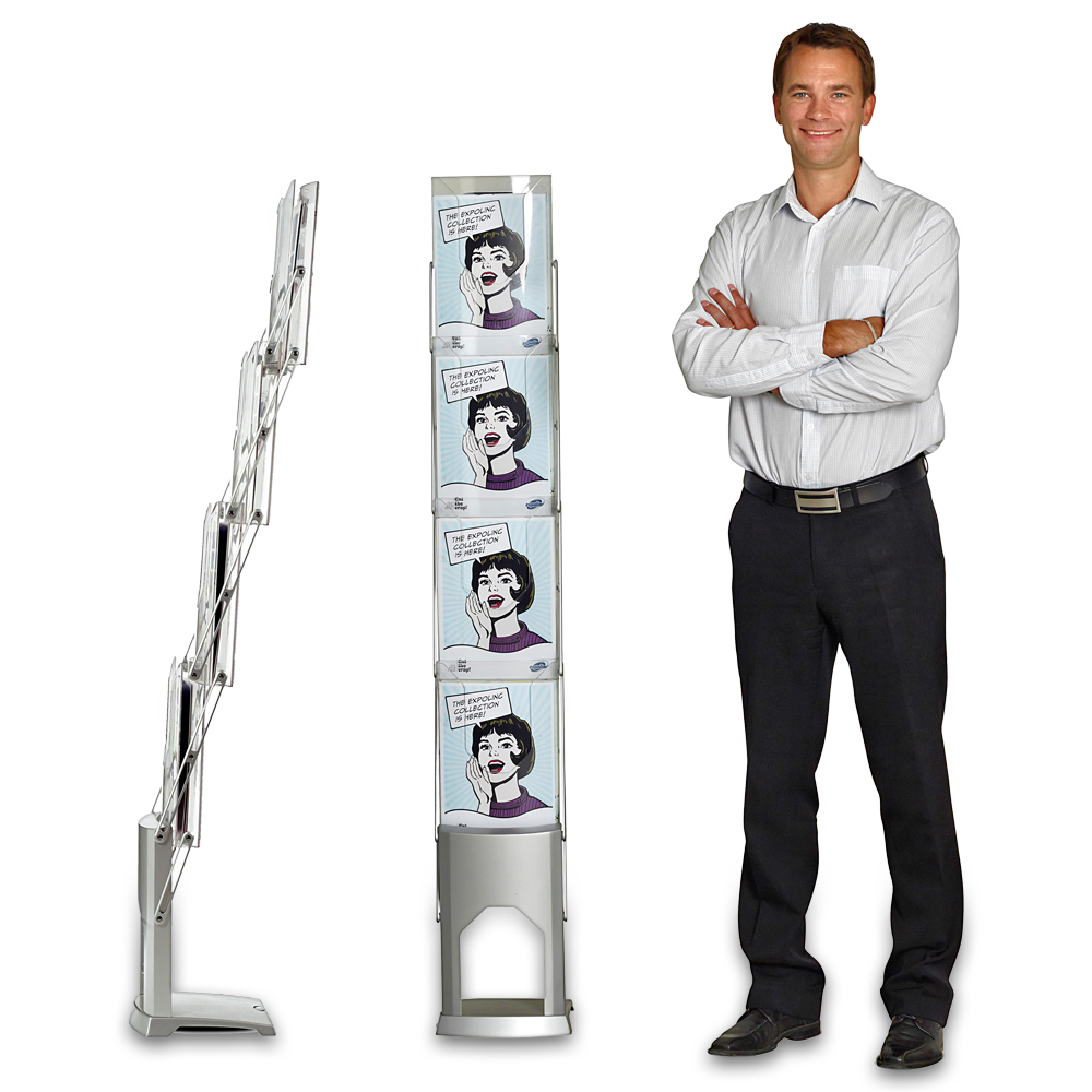 Profilerande komplement till utställningsmiljön, praktiskt att transportera trycksakerna. Robust utformning och följaktligen en intelligent konstruktion designat för snabb maximal exponering. Dessa exponeringsställ för broschyrer används med fördel på mässor och i olika andra miljöer så som hotell, receptioner, arenor och företag. Broschyrställets fördel är att man alltid har koll på broschyrerna och ser när de börjar ta slut. Broschyrställen finns på lager, vilket leder till en snabb leverans.