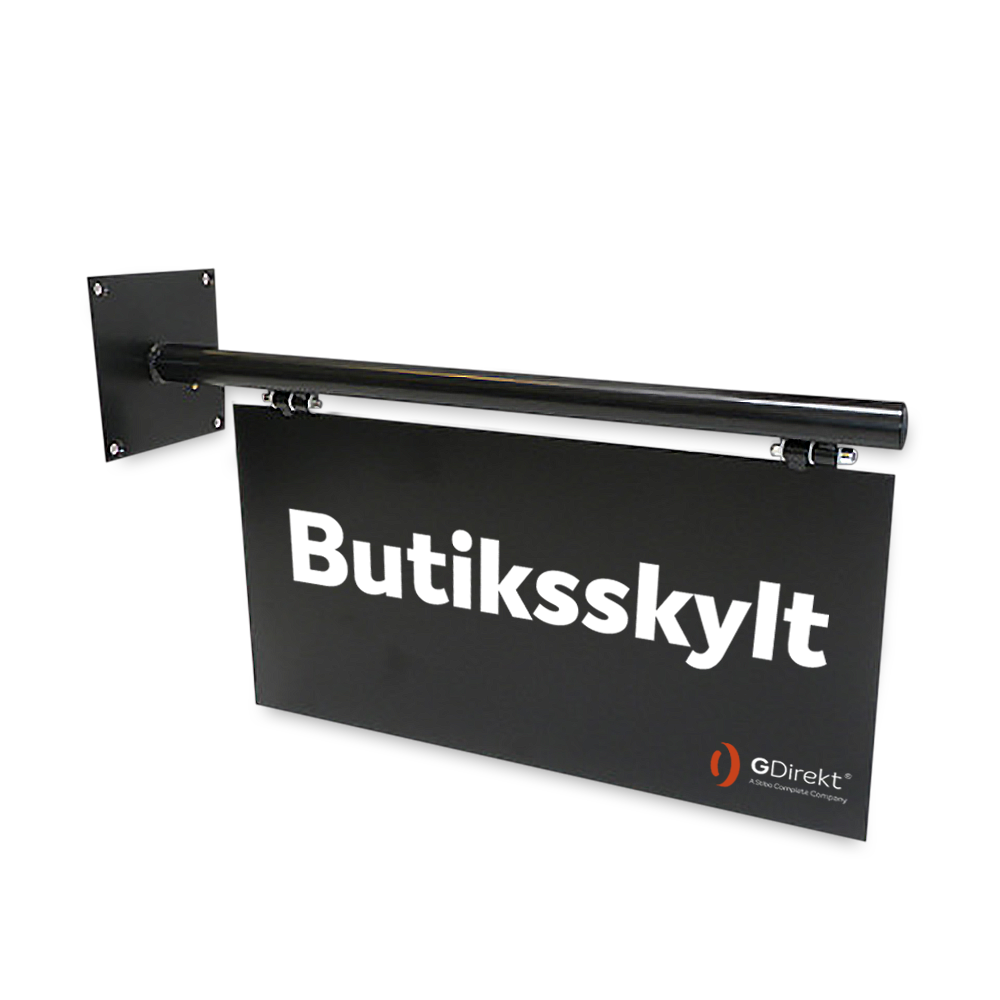 Butiksskylt är dubbelsidig med gångjärn. Perfekt att montera på fasaden ovanför entrén eller ingången till affären. Skruv och plugg ingår i priset! Beställ till Er logotext nedan, storleken på skylten är 55x30cm.