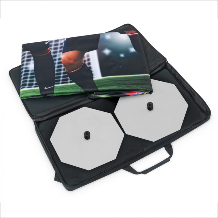EXL Fotovägg är en ställning för dubbelsidig backdrop i tyg. Framför allt en stabil bildvägg som man sätter ihop utan verktyg. Används till köpcentrum, idrottstävlingar, mässor och event. En högupplöst tryckt tygvepa ingår dessutom i prisets är till för inomhusmiljö. Leverans är inklusive väska för rören och en separat väska för fötterna som väger 3,5kg styck.
