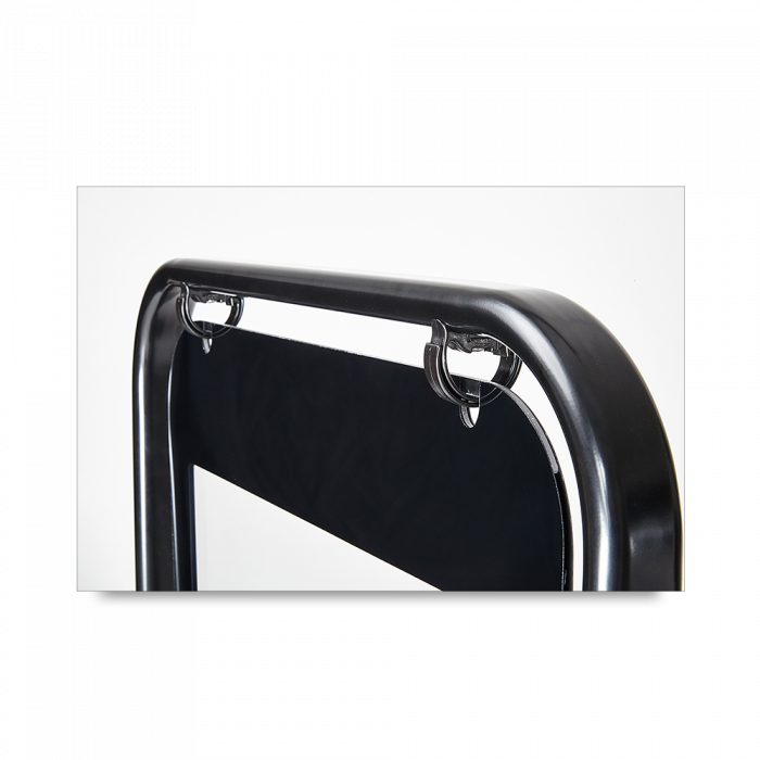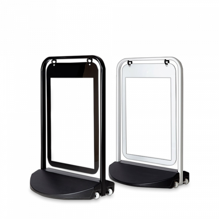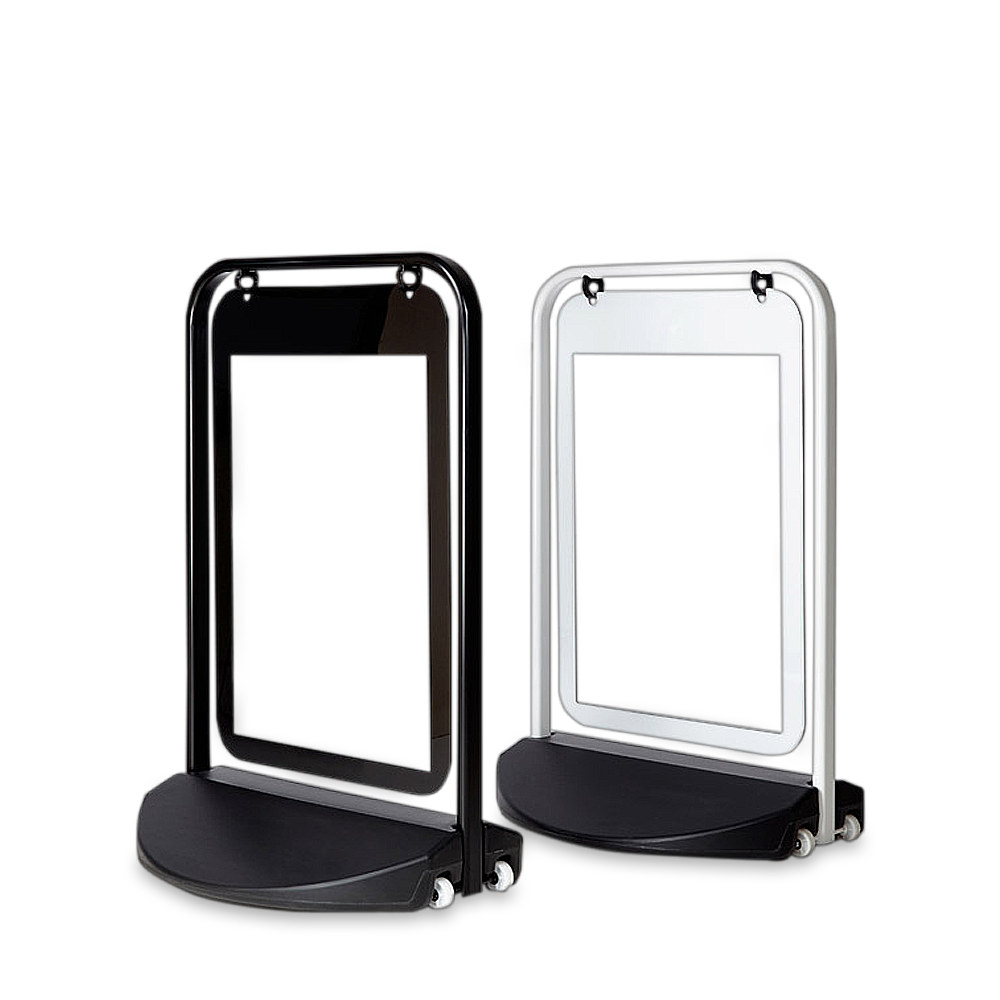 Gatupratare utomhus Swing är till för att visa sitt budskap, reklamerbjudanden eller menyer utomhus. Med denna trottoarpratare fångar Ni uppmärksamheten ock lockar kunderna till Er. Storleken på trottoarpratarna är 50x70cm. Affischerna bakom skyddsplasten sitter fast med en smart magnetficka där magneten är placerad på ett sätt som gör att vattnet inte kan rinna in i fickan och gör den därmed näst intill regntät. Stommen eller foten fyller man med vatten eller ännu bättre med sand. Då väger hela gatustället 15 kilo.
