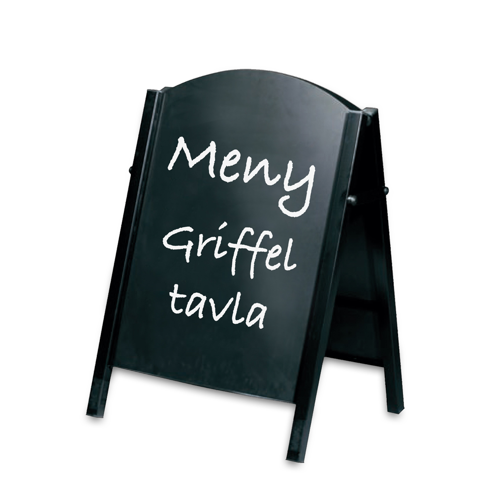 Griffeltavla gatuställ är till för att visa sitt budskap, reklamerbjudanden eller menyer utomhus eller inomhus. Med denna trottoarpratare fångar Ni uppmärksamheten ock lockar kunderna till Er. Storleken på trottoarpratarna är 50x70cm eller 70x100cm. Skivorna är lätta att dra upp och de är även vändbara. Stommen är zinkfosfaterad innan pulverlackering för lång hållbarhet.