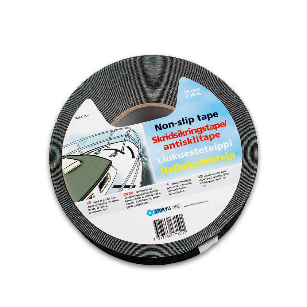 Halkskyddstejp 50mm – 18m ger effektivt grepp på hala ytor som trappor, ramper och golv. Den slitstarka, självhäftande tejpen från Stokvis är enkel att montera och passar både inom- och utomhus.