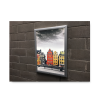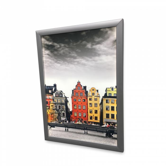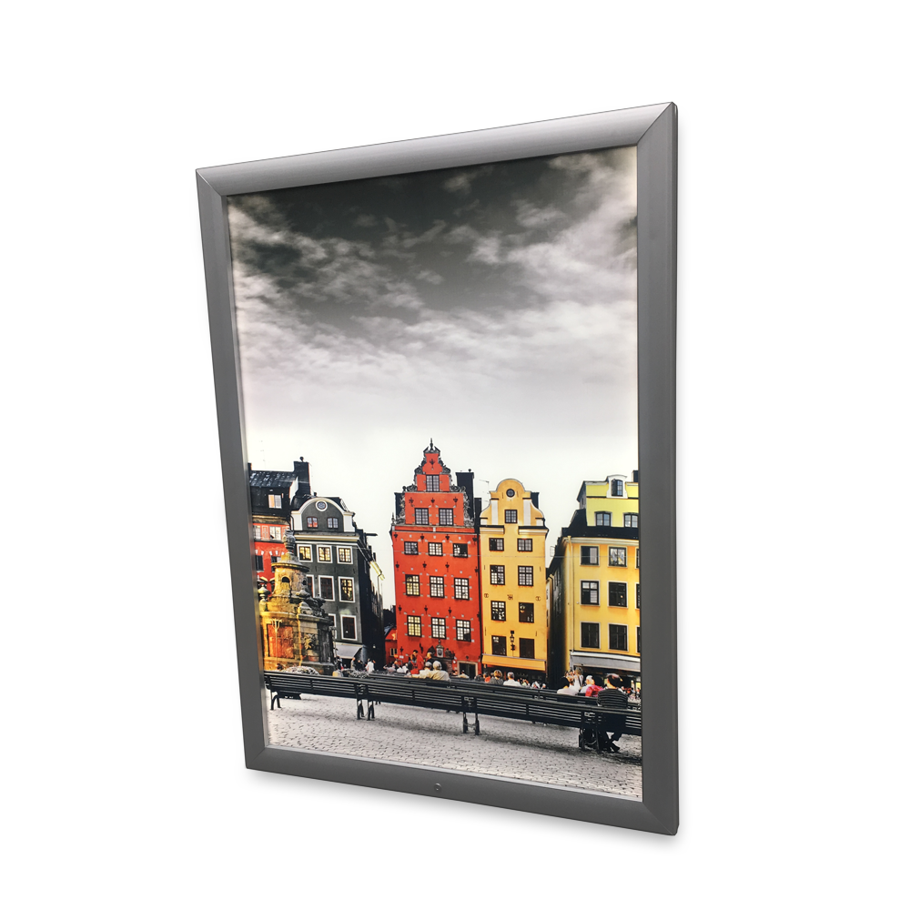 Bilden hålls fast med snäppram och skyddsplast. Den är låsbar med insexnyckel som medföljer i priset.