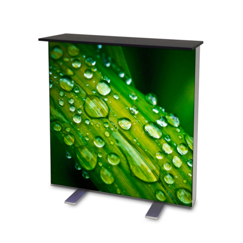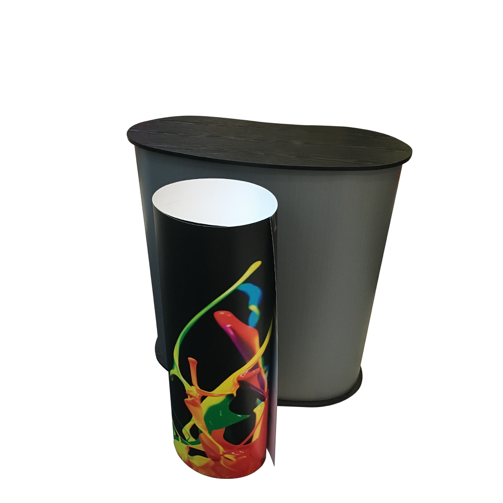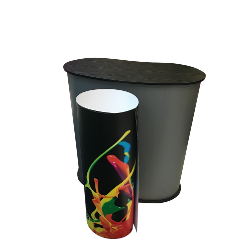 Måttet på bildvåden eller bildsvepet som en del säger är 187cm brett och 90cm högt. Det är mycket enkelt att sätta upp mässbordet och även smidigt att fästa ditt den tryckta bilden. Toppskivan är i mörk träliknande fanér som ser kanonfin ut. Inuti själva mässpodiet kan man förvara trycksaker (även dessa kan vara köpta på nätet, exempelvis ifrån oss här på Gdirekt).