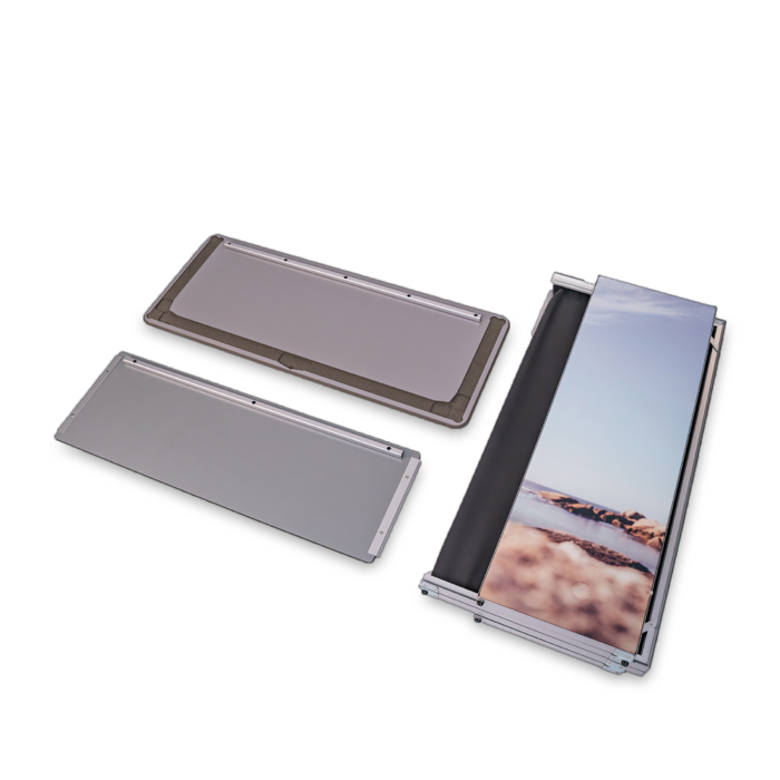 Tygbildernas mått till Mässbord Fold Out Counter är: Front 100×98.5cm och sidobilderna är 33.5×98.5cm. Ni kan ladda ner mallen nedan vilket självklart är gratis. Det är mycket enkelt att skapa ett tryckbara original när man har denna mall så storlek och placering av tex, bilder och logotyper blir rätt. Vår rekommendation när man skall göra en trycksak till dessa bildvåder som passar mässborden är att tänka enkelt.
