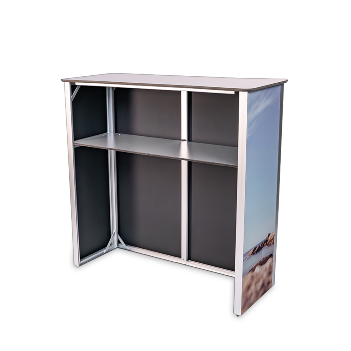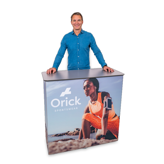Mässbord Fold Out Counter är ett mässdisk med tygbilder. Snabb och enkel hantering där bilderna redan är monterade. Använd gärna detta mässbord ihop med andra tygställ eller tygväggar i samma material! Bilden i tyg är färdigmonterad på disken och viks enkelt upp. Levereras komplett med ställning, 3st tygbilder, toppskiva i mörkgrått och hyllplan i vadderad nylonväska med hjul.