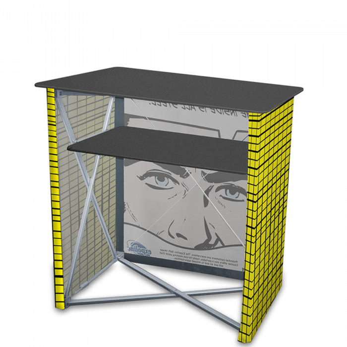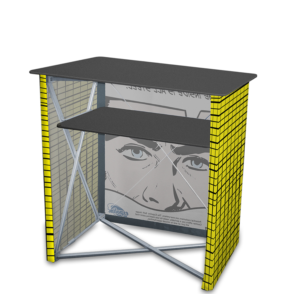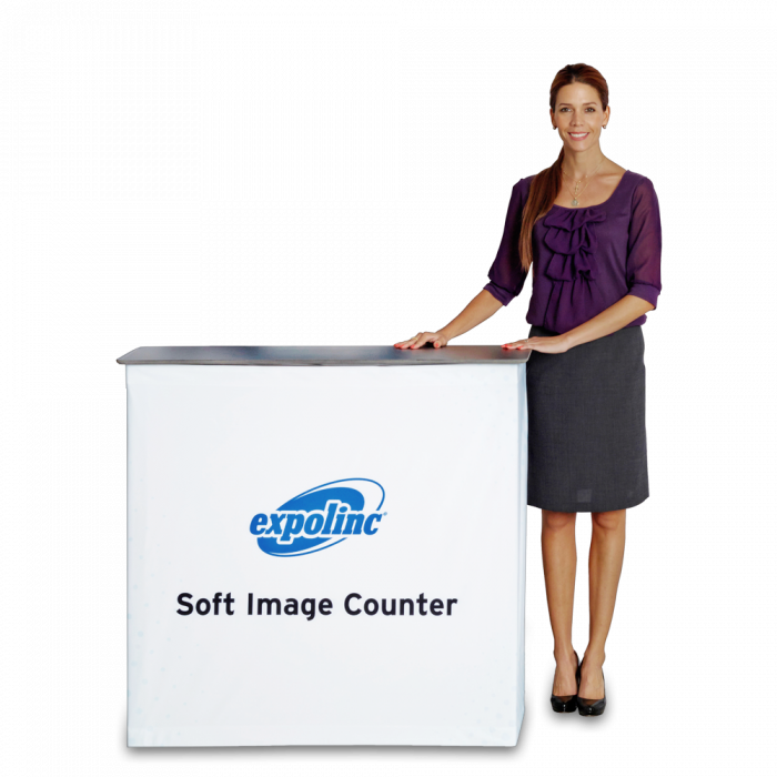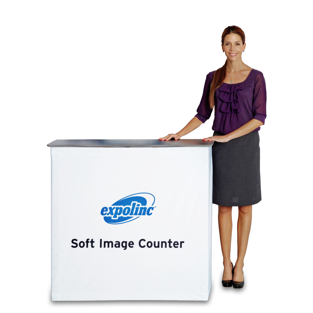 Det skall vara en logga eller en kort text slogan. Sedan bör färgvalet naturligtvis hålla sig till företagets, produktens eller föreningens färgprofil. Soft Image Counter är baserad på samma konstruktion som Soft Image, med tygbilden monterad med kardborrband. Den robusta konstruktionen spänner textilen till en perfekt, skrynkelfri presentation av ditt budskap. Det är en stabil mötesplats med invändig hylla för förvaring av marknadsmaterial. Disken i tyg fäller man upp och packa ner enkelt och passar speciellt till andra tygställ. Se alla våra andra modeller och storlekar på mässbord och diskar.