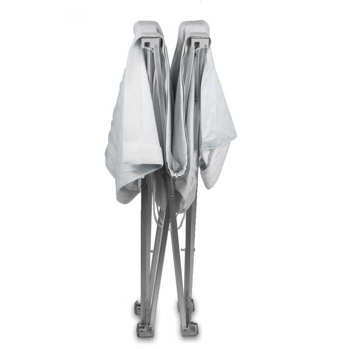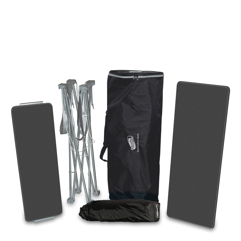 Mässbord Soft Image disk är 106x102cm och 40cm djup med tygfront som dras upp på någon minut. Passar bra till tygväggar i samma material. Levereras i en svart nylonväska samt med en hylla.