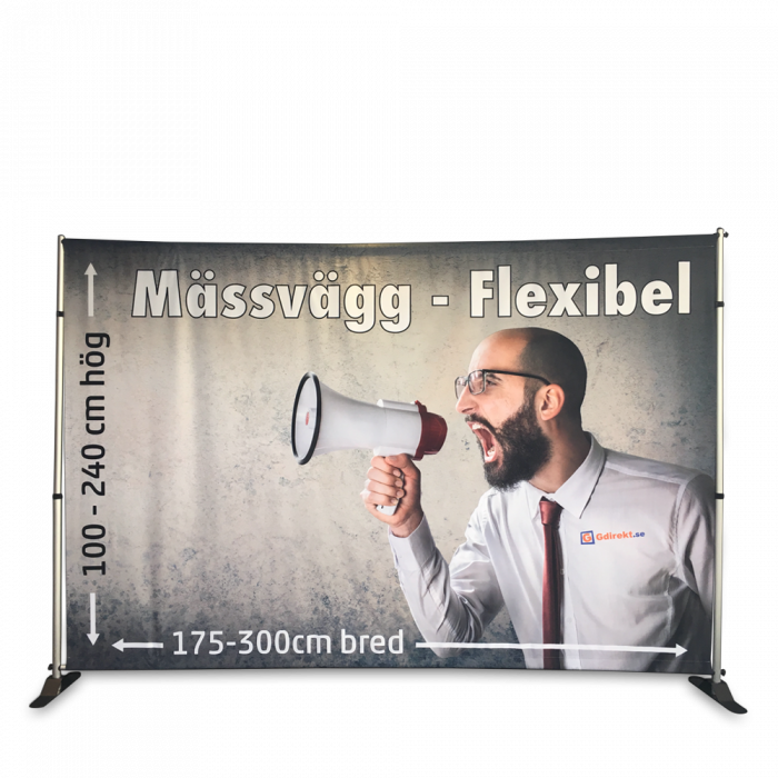 Mässvägg Flexibel – med tygvepor är vad namnet säger. Tygbilden kan vara från 175cm bred upp till hela 300cm bred. Höjden från 100cm upp till 240cm hög. Systemet är framför allt i tålig aluminium och levereras i en vadderad nylonväska. Vill man köpa en mässmonter så är detta dessutom ett billigt alternativ som fungerar bra. Backdrop ställning är smart och enkel.