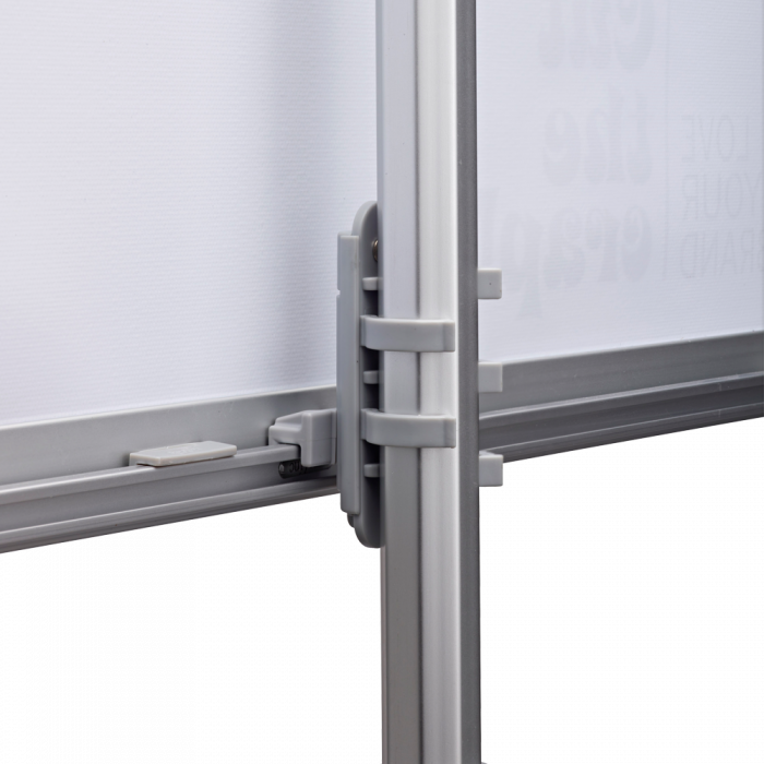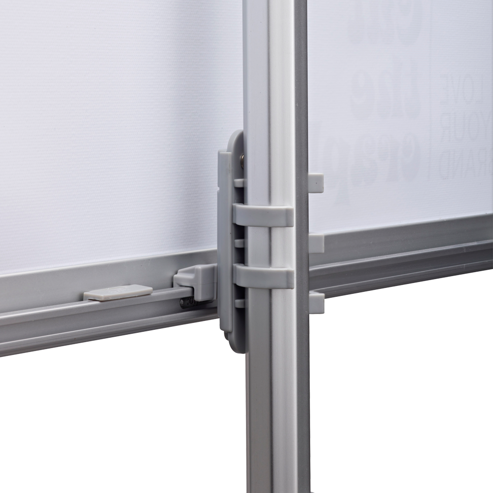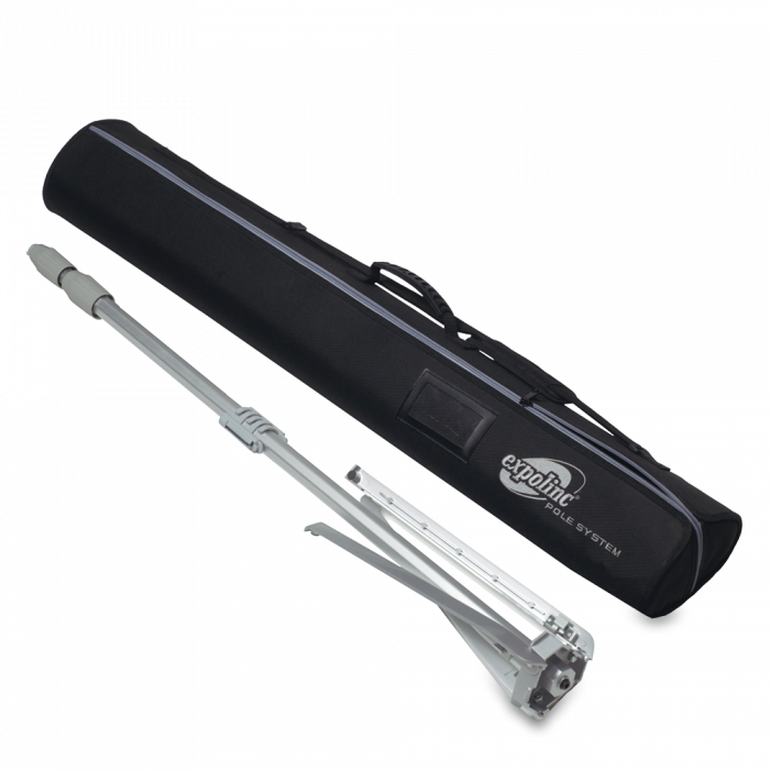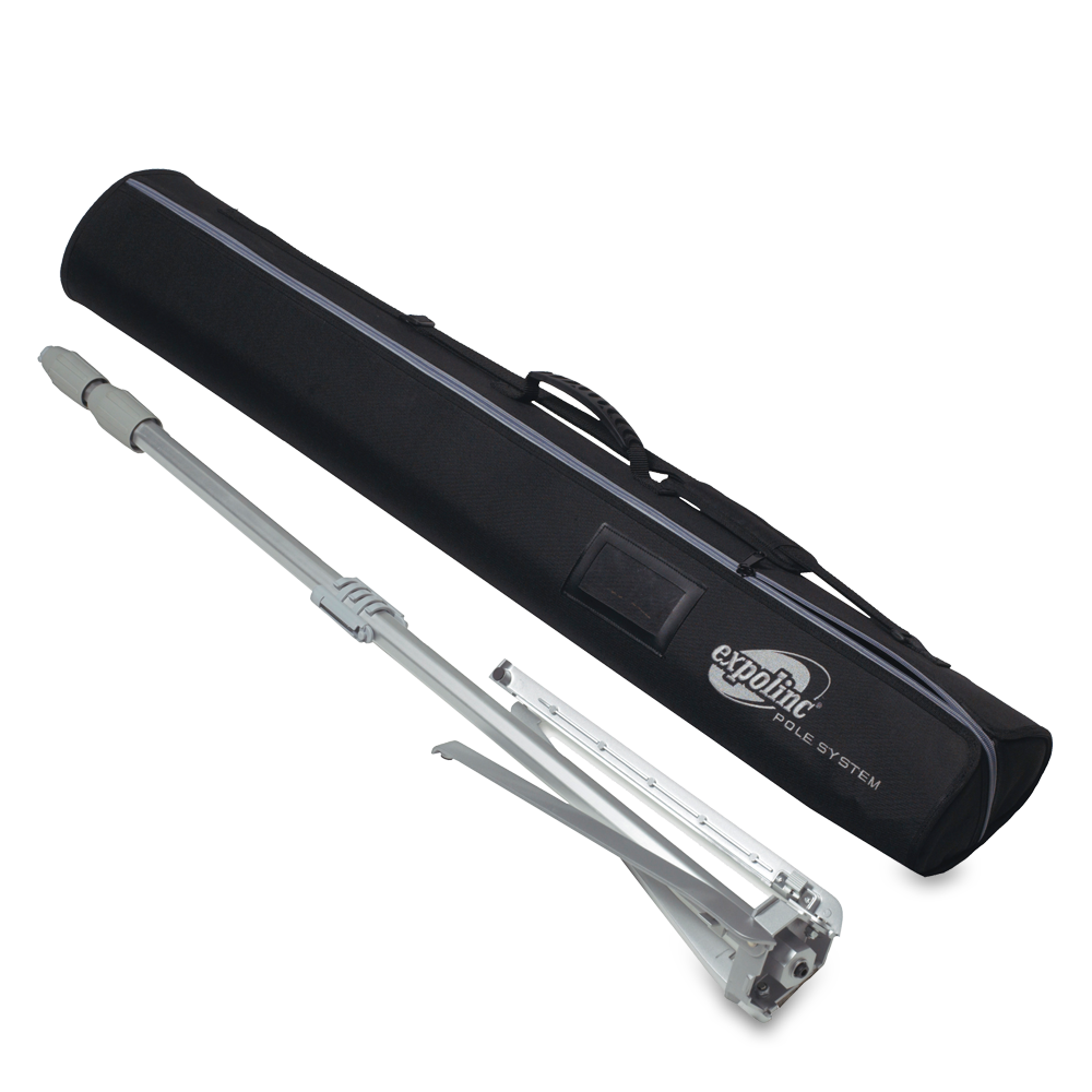 Pole System displayställ – bildvåd från Expolinc är framför allt ett snyggt exponeringsställ som finns i flera bredder, välj höjd mellan 100x240cm. Fördelen är att inga lösa delar som behöver sättas ihop tack vare en smart design. Med några enkla grepp fäller du ut stödbenen i, drar upp den steglösa teleskoppinen och hakar fast bilden. Därför är detta ett bra displaysystem. Bildhållaren är producerad i aluminium och stål. Vi använder en fin väv som håller sig rak. Mässmontern eller produktlanseringen får ett lyft om man tröttnat på vanliga rollups.