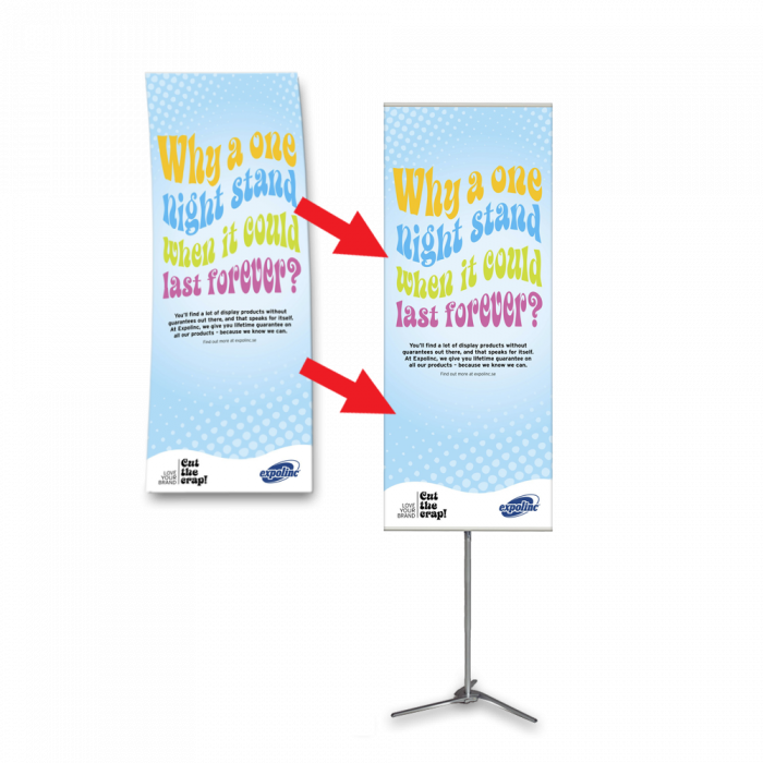 Pole System displayställ – bildvåd till Expolinc Polesystem finns i flera bredder, höjd mellan 100-240cm. Monteras på nolltid med några enkla grepp. Fäll ut stödbenen, drar upp teleskoppinnen och haka fast bilden. Obs, detta är endast bildvåd och tryck ingår såklart.