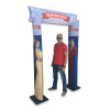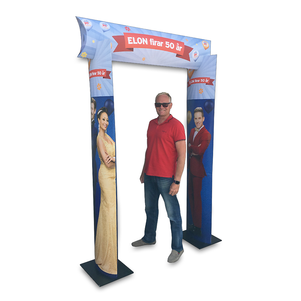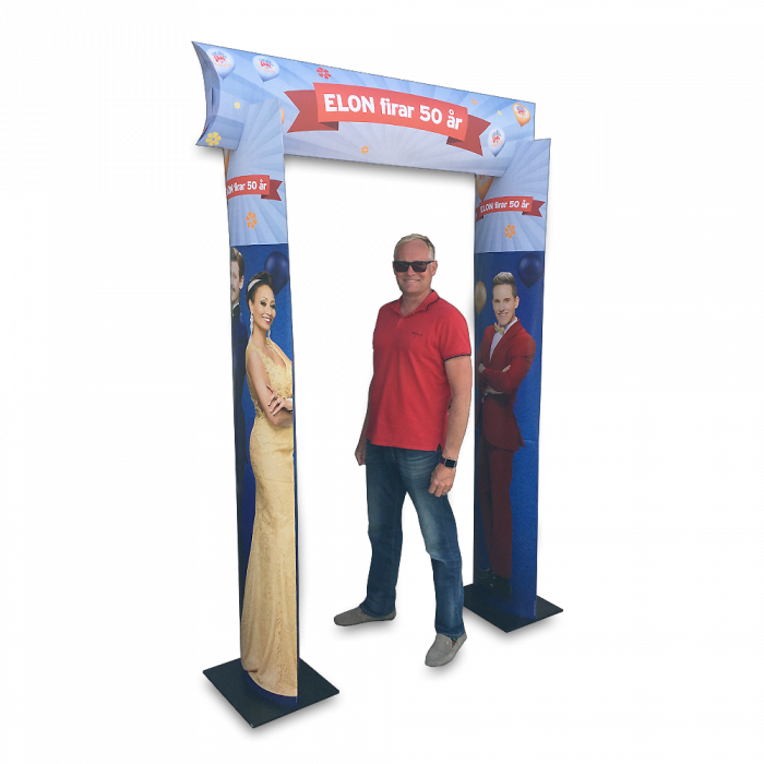 Bottenplattan är tillverkad i MDF med svart laminat. 2 Stand pelarna är 50cm breda och 160cm eller hela 180cm höga. Sedan är det två extra hylsor som är 60cm höga. Den invändiga höjden blir antingen 220cm eller 240cm. Den liggande portalen är 50cm hög så totalt höjden är 270cm eller 290cm. Detta gör att den tryckta portalen syn mycket bra vid entréer i butik och köpcentrum. Fungerar även bra till kampanjer och event på arenor. Man kan beställa nya bilder till portalen som passar bra till kampanjer som butiksreklam.