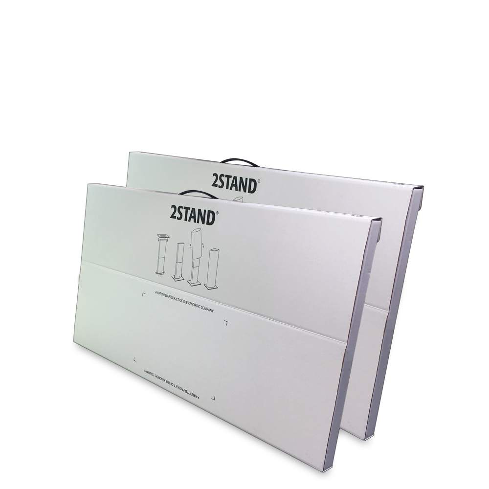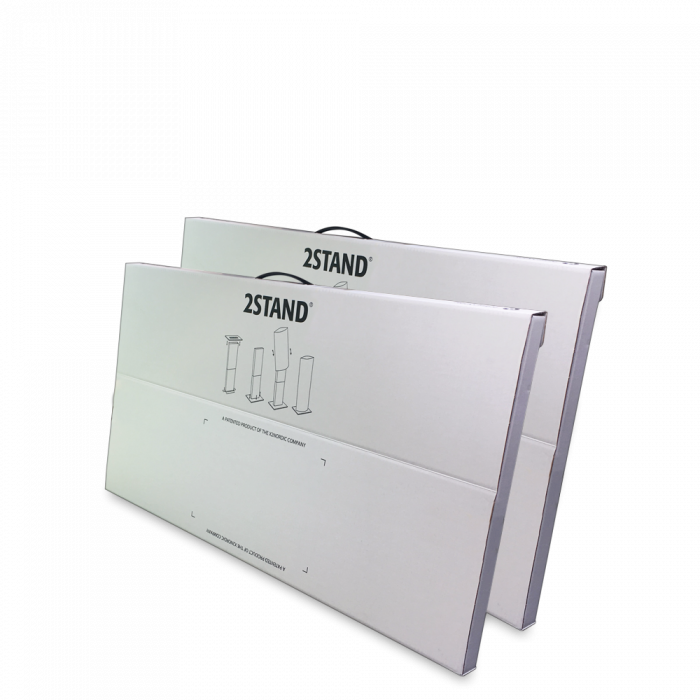Portal 2Stand i tryckt kartong har dubbelsidiga pelare/elipser. Invändig höjd 220cm(totalt 270cm) eller 240cm(totalt 290cm), överdelen är 180x50cm. Det ingår två dubbelsidiga pelare 50cm breda med bottenplatta i MDF med svart laminat, två topphylsor som är 60cm höga samt överdelen. Levereras i två kartongväskor med handtag och är enkel att montera upp.