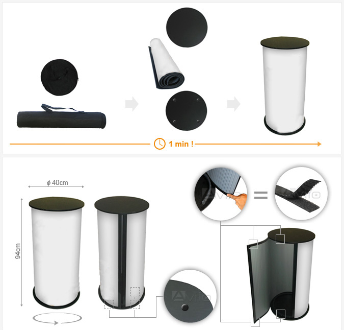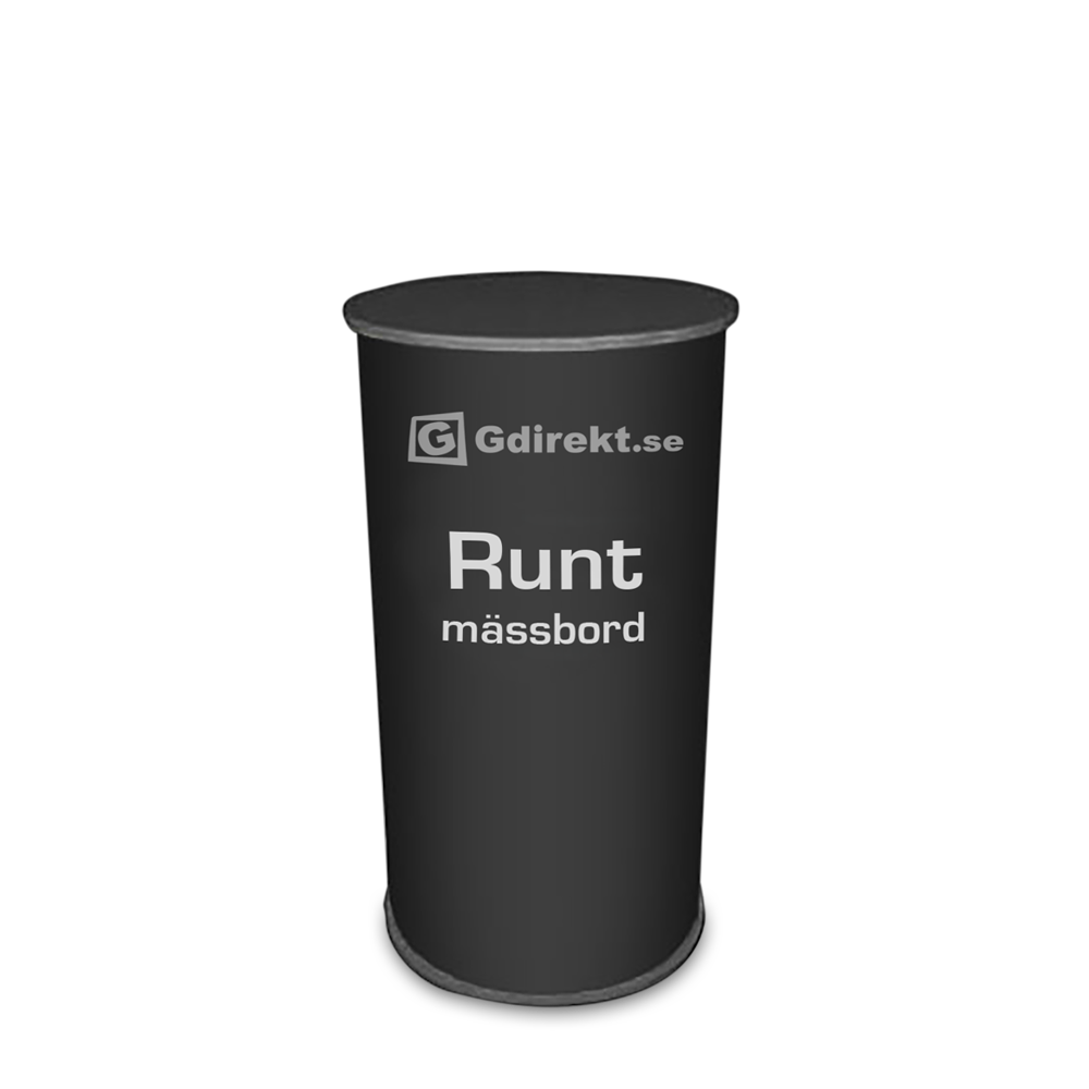 Runt mässbord är ett enkelt och billigt mässbord med bordsskiva i svart. Det går snabbt att montera upp och kräver inga verktyg. Förvaringsutrymme finns inuti disken för till exempel en jacka eller trycksaker. Perfekt till mässan eller butiksvisningen. Storleken är 94cm hög och diametern är 40cm. Det ingår även tryckt bildvåd i priset som är hållbar och med hög tryckkvalité.