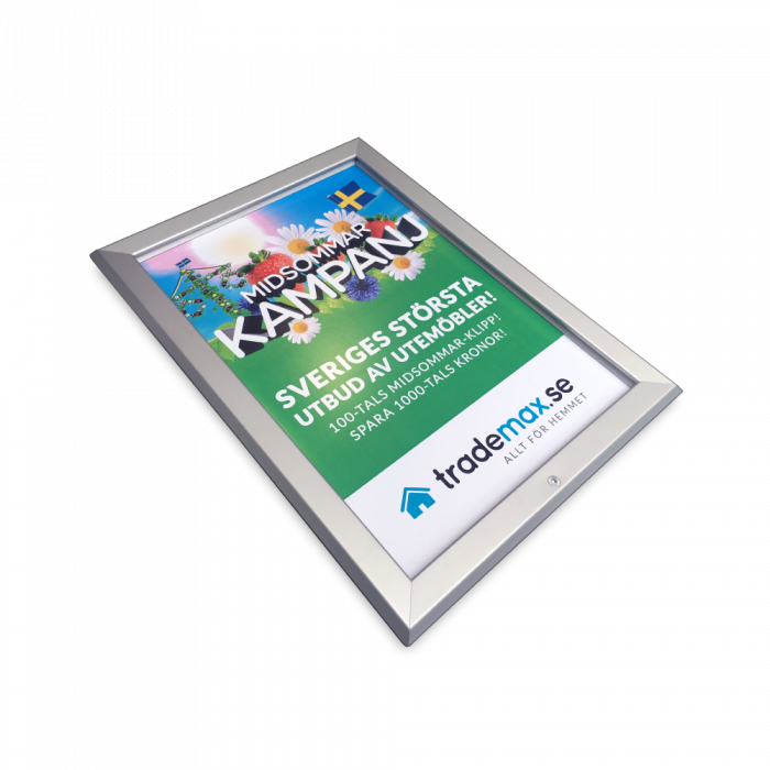 Snäppram låsbar i aluminium finns i storlekarna A4, A3, 50x70cm och 70x100cm. Ramarna är mycket hållbara och fungerar inomhus och utomhus. Skruv och plugg ingår. Man låser enkelt alla sidorna med en indexnyckel i understa profilen.