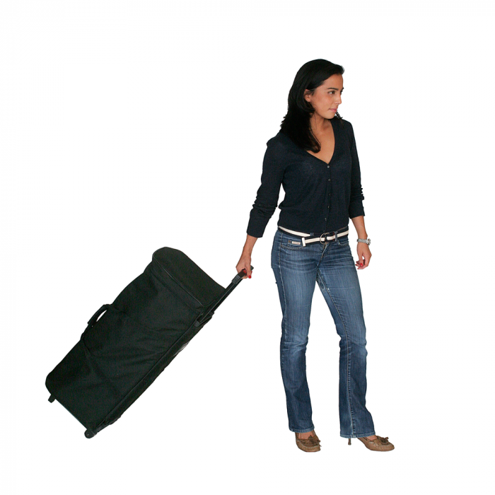 Väska med hjul till Pop up tygvägg är en svart kraftig väska i slitstark och vattentät nylon. Smart att förvara och transportera era tygsystem till mässan. En tålig och hårdare bag med handtag och hjul. Väskan rymmer ett tygställ med bildvepa. Se alla våra mässväggar med tryck! Storleken på denna väska är 29x29x85cm