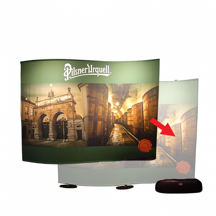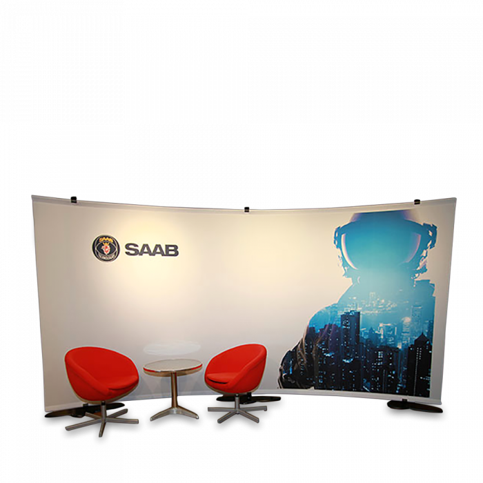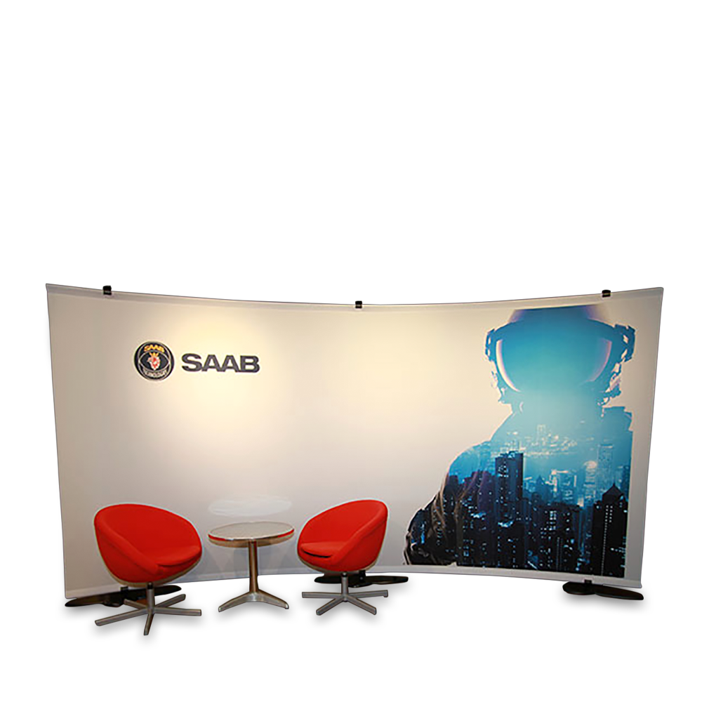 Ny bild till Scene UltraLight från Maxibit som är ett tygdisplay system som ryms i en smidig svart väska som tål en hel del. Monteringstiden är endast några minuter. Unikt är att du väljer form själv, böjt, rak eller varför inte kurvad.
