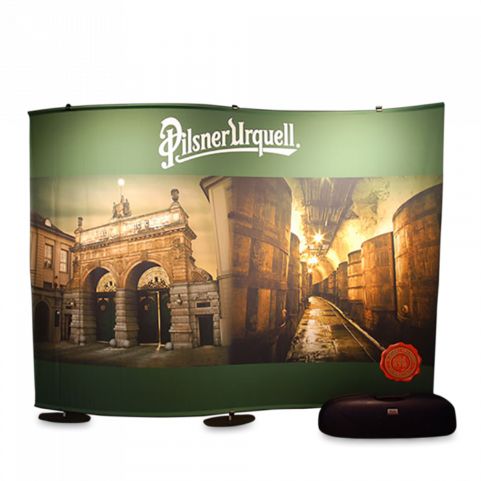 Vepa till Tygställ Scene ultra light – 300x225cm Är en tygbild till mässväggen som ryms i en lite väska, antagligen marknadens smidigaste tygvägg. 300x225cm (bildmått 300x219cm) fungerar i flera former, rak, böj/kurvad.